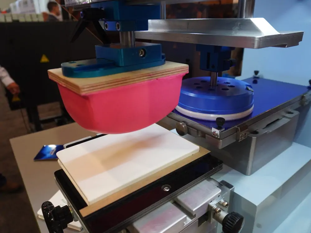 La tampografía es una técnica de impresión indirecta que transfiere tinta a través de un tampón de silicón hacia la superficie del producto.